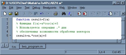 – вихідного параметра, ім'я самої функції f _ name і список її вхідних параметрів, відокремлених комою. Увага: Ім'я М-файлу функції повинне співпадати з ім'ям самої функції (f _ name). MATLAB автоматично привласнює дане ім'я при виконанні команди Save as.