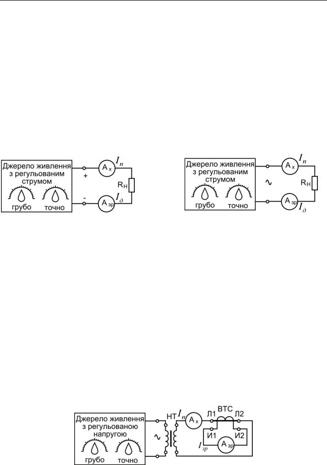 У випадку, якщо межі вимірювання перевірюваного амперметра змінного струму перевищує межу вимірювання зразкового амперметра, то зразковий амперметр підключають через вимірювальний трансформатор струму ВТС. Схема представлена на рис. 5.4. Для одержання необхідного значення струму можна застосовувати навантажувальний трансформатор струму НТ.