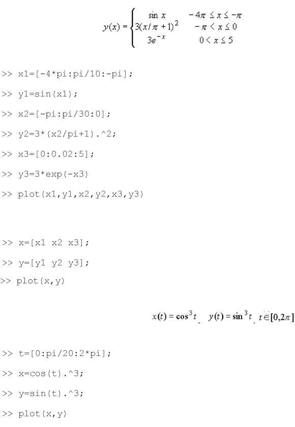 але тоді слід використовувати різні вектори для значень аргументів і обчислювати значен функцій від відповідних векторів. Для отримання графіка кусочно-заданої функції: