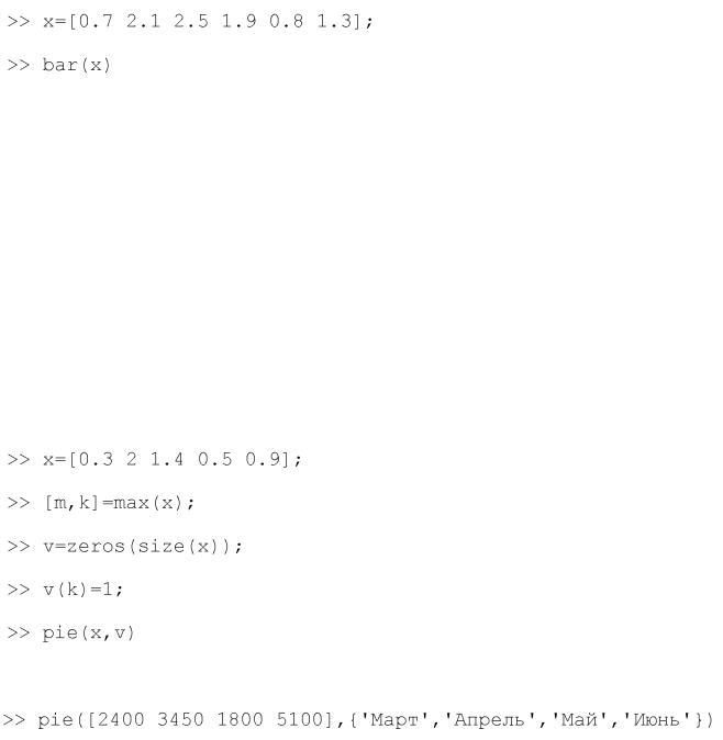 Порівняєте, наприклад pie([0.1 0.2 0.3])і pie([1 2 3]). Можна відокремити деякі сектори від всього круга діаграми, для чого слід викликати pie з другим аргументом — вектором тієї ж довжини, що початковий. Ненульові елементи другого вектора відповідають відокремлюваним секторам. Наступний приклад показує, як відокремити від діаграми сектор, відповідний найбільшому елементу вектора х: