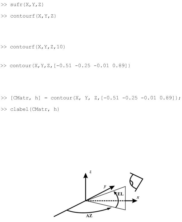 ·contour — плоский графік з лініями рівня; про contourf — залитий кольором плоский графік з лініями рівня; про contour3 — поверхня, складена з ліній рівня; про surf 1 — освітлена поверхня Всі перераховані функції допускають теж саме звернення, що mesh, наприклад: