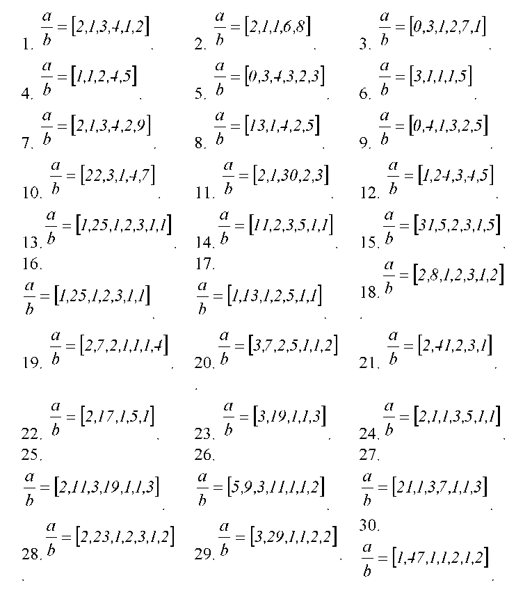 Завдання 3. Раціональне число а / b задане ланцюжком неповних часток. Побудувати відповідне найменше раціональне число а / b і знайти розв’язок рівняння ах + b у = 1