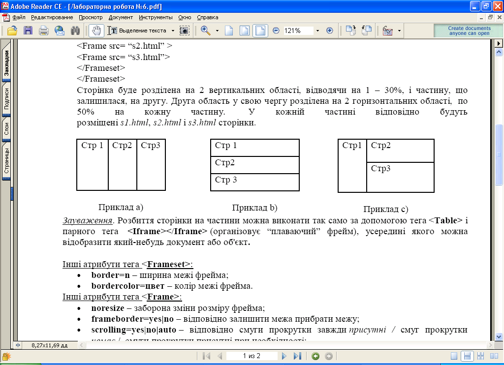 Зауваження. Розбиття сторінки на частини можна виконати так само за допомогою тега <Table> i парного тега <ІFrame></ ІFrame > (організовує "плаваючий" фрейм), усередині якого можна відобразити який-небудь документ або об'єкт.