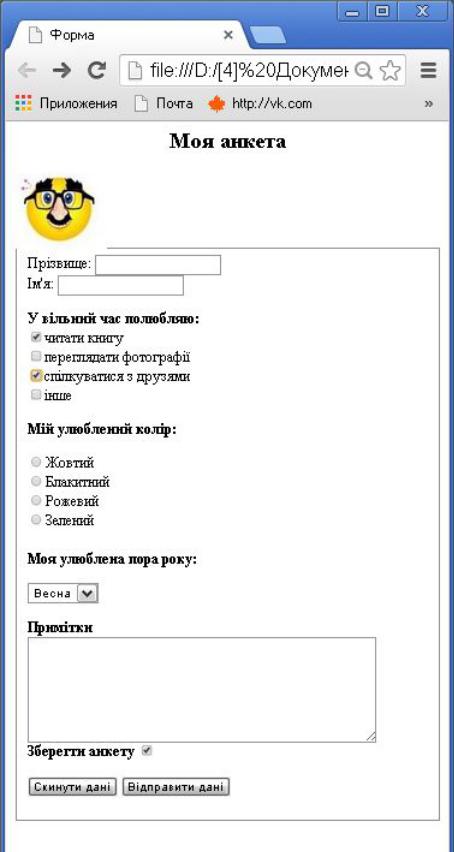 Коли користувач заповнює форму, йому може потрібно почати все спочатку. На такий випадок існує кнопкаReset, по якій користувач може клацнути мишею, щоб