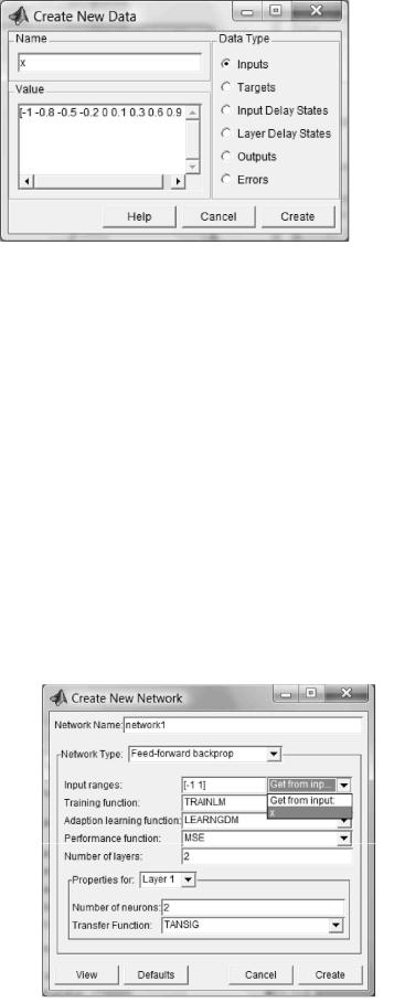 З цією метою спочатку натиснемо кнопку New Data далі в полі Name вікна Create New Data введемо спочатку ім'я змінної х, потім в області значень Value вектор значень [-1 - 0.8 - 0.5 - 0.2 0 0.1 0.3 0.6 0.9 1] і, використовуючи радіокнопку Inputs (у правій частині вікна), вкажемо тип змінних (Inputs — Входи).