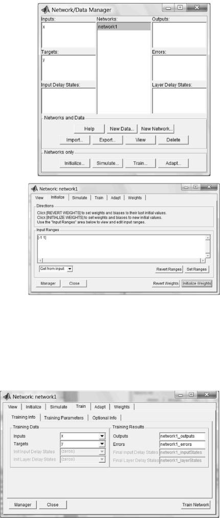 Для введення в панеліNetwork: network1 встановлених діапазонів і ініціалізації вагів скористаємося кнопками Set Ranges (Встановити діапазони) і Initialize Weights (Ініціалізувати ваги). Якщо потрібно повернутися до колишніх діапазонів, то слід вибрати кнопки Revert Ranges (Повернути діапазони) і Revert Weights (Повернути ваги), але в умовах прикладу це не потрібно.