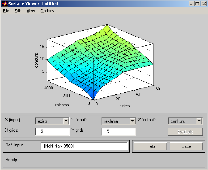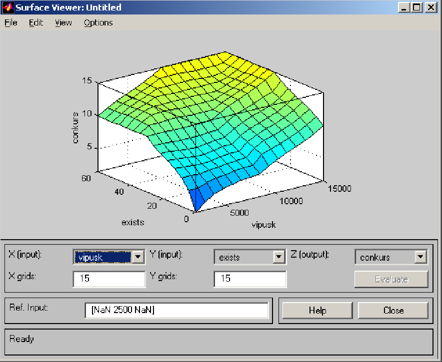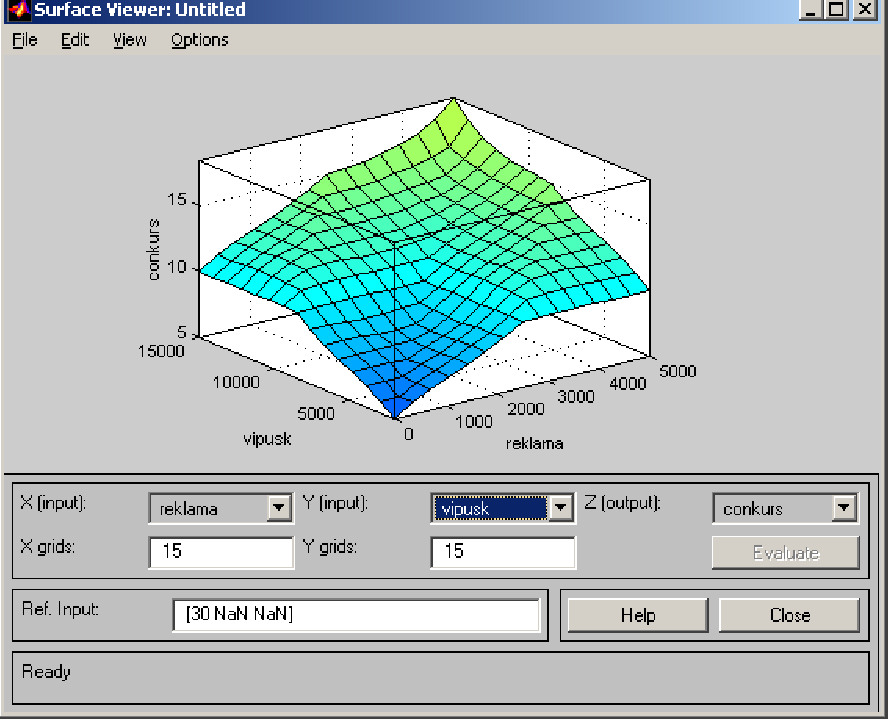 evalfis (A, ES51) Результатом цієї функції є значення вихідної координати системи нечіткого логічного висновку для конкретного значення вектора вхідних координат.