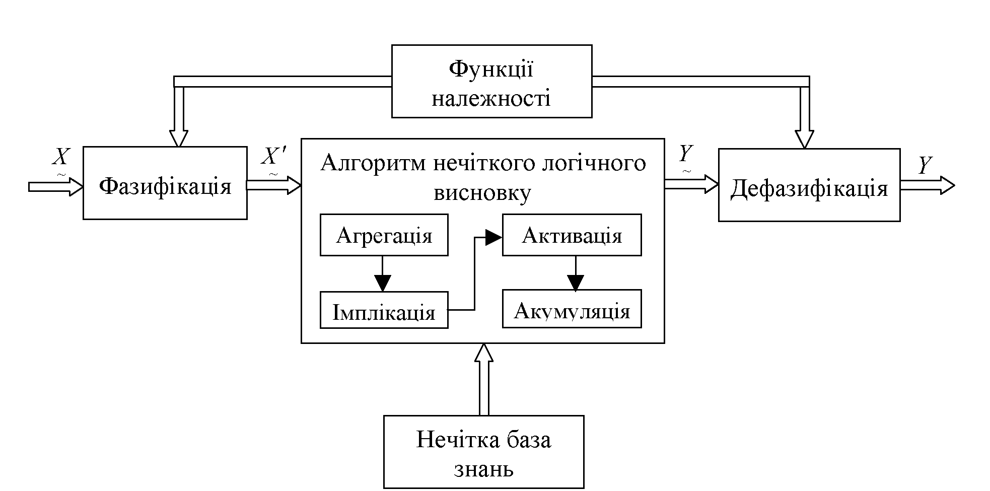 Блок нечіткого логічного висновку прогнозує вектор нечітких значень вихідних змінних (Y), який відповідає вектору нечітких значень вхідних змінних (X); нечіткий логічний висновок виконують у декілька етапів: