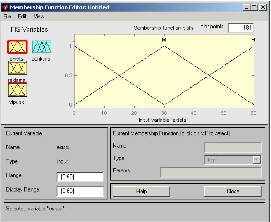 Командою меню Edit\Add_mfs задамо число лінгвістичних термів (3) для координати Exists та форму їх функцій належності (trimf – трикутна).