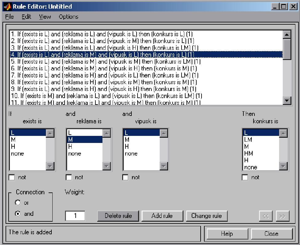 if Exists is (L, M, H) and Rekslama is (L,M,H) and Vipusk is (L,M,H) then Konkurs is (L, LM, M, HM, H) та вводячи його в базу правил за допомогою кнопки Add_rule.
