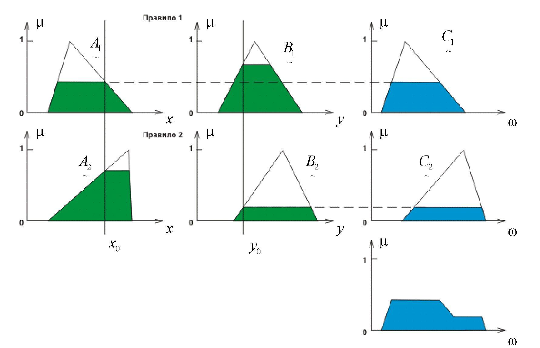 Нечітка імплікація визначає формулу, згідно з якою модифікується терм вихідної змінної, відповідно до агрегованого значения входів правила.