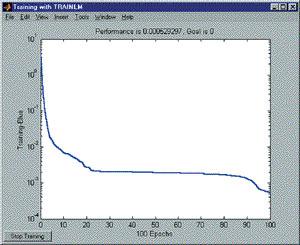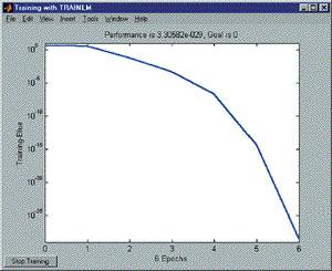 Для вирішення цього завдання вибрана мережа Feed-forward| backprop| з п'ятьма сигмоїдними| нейронами першого шару і п'ятьма лінійними нейронами другого шару. Алгоритм навчання - Льовенберга-маркардта. З такою конфігурацією мережа після восьми епох навчання дала помилку порядка| 10-30.