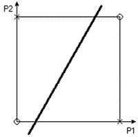 Що ж мається на увазі під "лінійною невіддільністю" множин? Щоб відповісти на це питання, зобразимо безліч вихідних значень в просторі входів (мал. 10), слідуючи наступному правилу: поєднання входів P1| і P2|, при яких вихід A звертається в нуль, позначаються кружком, а ті, при яких A звертається в одиницю - хрестиком.
