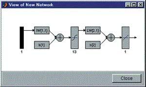 Виберемо персептрон (Feed-Forward| Back| Propa-gation|) з тринадцятьма сигмоидными| (TANSIG|) нейронами прихованого шару і одним лінійним (PURELIN|) нейроном вихідного шаруючи. Навчання проводитимемо, використовуючи алгоритм Льовенберга-маркардта (Levenberg-Mar-quardt|), який реалізує функція TRAINLM|. Функція помилки - MSE|. Отримана мережа має вигляд, зображений на мал. 13.