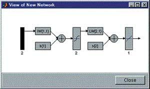 Виберемо персептрон з двома нейронами прихованого шару, у яких функції активації сигмоїдні|, і одним вихідним нейроном з лінійною функцією активації (мал. 11). Як функція помилки вкажемо MSE| (Mean| Square| Error| - середній квадрат помилки). Нагадаємо, що функція помилки встановлюється у вікні "Створення мережі" після вибору типу мережі.
