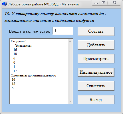 13. У створеному списку визначити елементи до мінімального значення і видалити слідуючи.