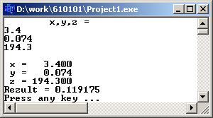 printf("\n x = %7.3lf\n y = %7.3lf\n z = %7.3lf\nRezult = %lf\n", x, y, z, rez);