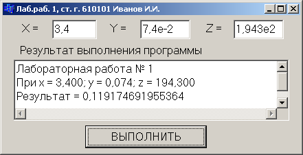 В результаті повинне вийти робоче вікно (мал. 1.3). Якщо клацнути мишею по кнопці «ВИКОНАТИ», у вікні Memo1 з'явиться відповідний текст (результат). Далі у віконцях Edit* можна змінювати початкові значення і, натискаючи кнопку «ВИКОНАТИ», отримувати нові результати.