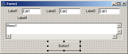 2. Оформляємо вікно форми, замінивши заголовок Form1 на потрібний текст. Поміщаємо на форму необхідні компоненти Label1, Label2, Label3, Label4 (вставляючи в Caption відповідні тексти), Edit1, Edit2, Edit3, Memo1 зі смугами прокрутки, Button1 (замінивши в Caption текст).