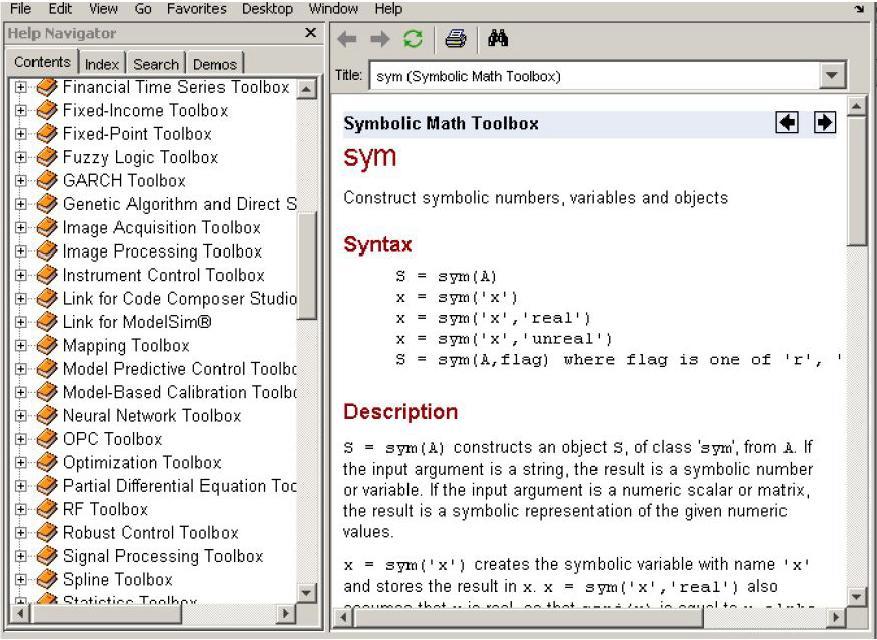Для отримання довідки по командах пакету Symbolic| Math| Toolbox| (рис.1) слід відкрити відповідний розділ Help|, або отримати допомогу по команді: