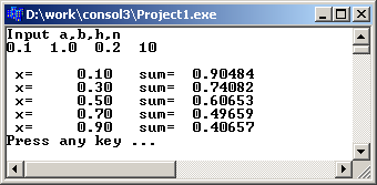 Результат програми з введеними значеннями a=0.1, b=1.0, h=0.2 і n=10: