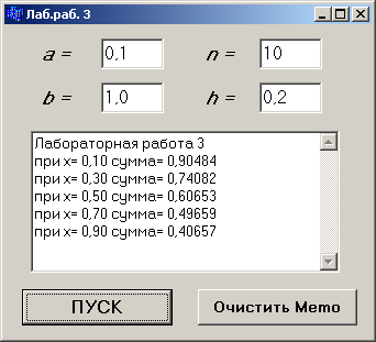Роботу програми перевірити для a = 0,1; b = 1,0; h = 0,1; значення параметра n вибрати залежно від завдання.