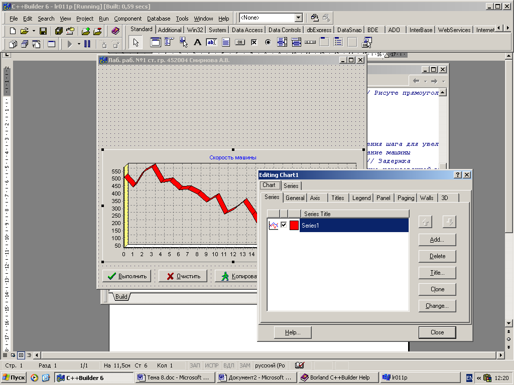 Побудова графіку (діаграми) проводиться по вичислених значеннях координат точок х і у = f(х), які за допомогою методу АddХУ передаються в спеціальний двомірний масив Sеrіеs [k] компоненти Сhаrt (k = 0, 1, 2, ... – номер використовуваного графіку).