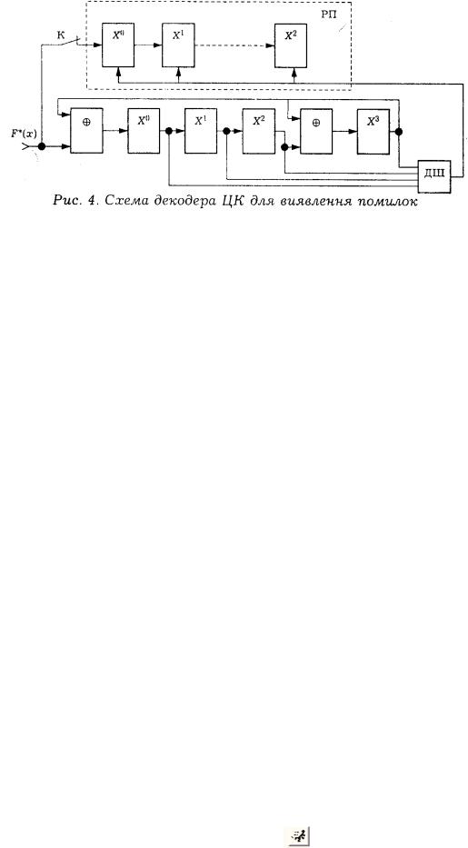 На рис. 4 наведена схема декодера ЦК в режимі виявлення помилок, до складу якого входять регістр пам’яті РП, дешифратор ДШ помилок і подільник, виконаний за схемою рис. 2.