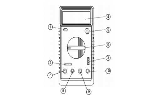 1 – кнопка включения питания; 2 – гнездо для измерения подключения электрических конденсаторов; 3 – гнездо для измерения температуры; 4 – ЖК дисплей; 5 – гнездо подключения транзисторов; 6 – переключатель функций; 7 – гнездо для подключения щупа при измерении силы тока до 10 А; 8 - гнездо для подключения щупа при измерении силы тока до 200 мА; 9 – гнездо COM; 10 -гнездо для подключения щупа при измерении напряжения, частоты, сопротивления