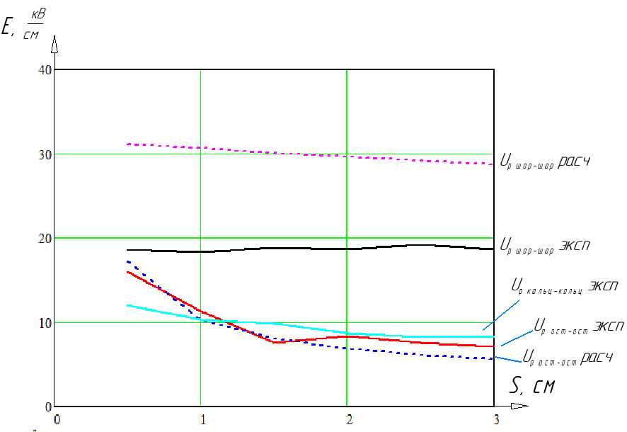 В ходе лабораторной работы на переменном напряжении была исследована зависимость разрядного напряжения в воздухе от расстояния между электродами при различной форме электродов. Как видно из зависимостей Uр= f(S), чем больше расстояние между электродами, тем больше разрядное напряжение. Это подтверждается теорией возникновения разряда. С увеличением S графикам наблюдается уменьшение Eср, это объясняется тем, что неоднородность поля возрастает с увеличением расстояния. В опыте при системе электродов остриё - остриё экспериментальные данные и расчётные наиболее точное совпали между собой, так как были закреплены наиболее симметрично. Шар-шар имели электрическое поле отличное от теоретического из-за отсутствия соосности между электродами. Для остальным систем электродов не существует расчётных формул, поэтому нет возможности сравнить совпадение экспериментальных данных с расчётными.
