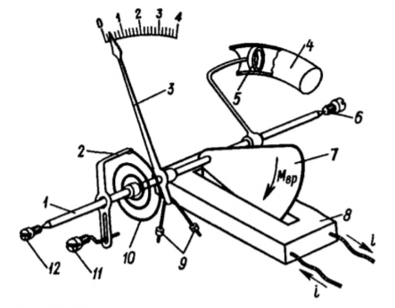 1 – ось; 2 – поводок; 3- стрелка указателя; 4 – цилиндр воздушного успокоителя; 5 – поршень воздушного успокоителя; 6,12 – подпятники; 7 – ферромагнитный сердечник; 8 – катушка с током; 9 – противовесы; 10 – спиральная пружина; 11 – винт корректора