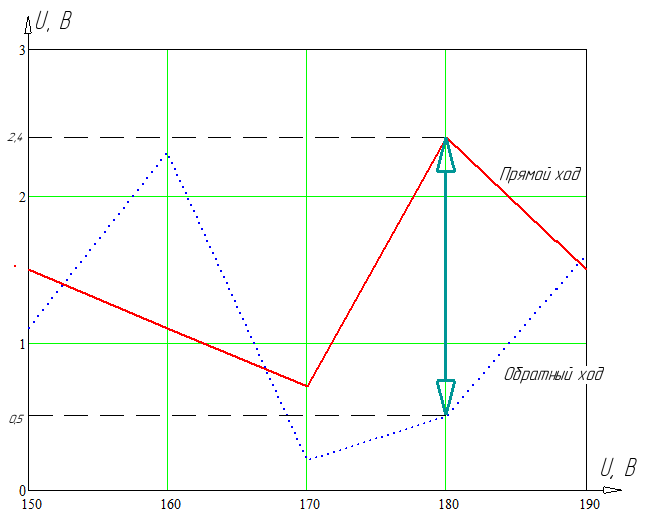 Максимальная абсолютная погрешность прибора: Прямой ход – 2,4 В; Обратный ход – 2,3 В;