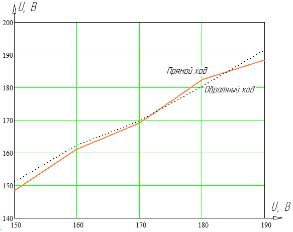 В одной системе координат построим график зависимостей значений напряжения, полученных с помощью рабочего эталона при прямом и обратном ходах, от значений измеряемой величины, полученных с помощью поверяемого прибора.