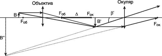 Предмет В помещается вблизи переднего фокуса объектива (Fоб) с таким расчетом, чтобы его действительное, увеличенное изображение B' находилось между окуляром и его передним фокусом. При