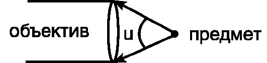 Угловая апертура (u) - угол между крайними лучами светового пучка, входящего в линзу объектива от предмета.