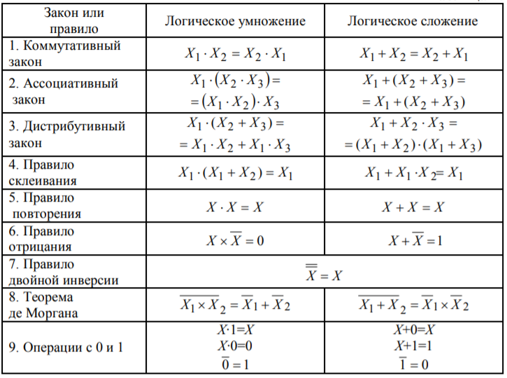 В таблице 1 приведены основные законы и правила преобразования логических уравнений.