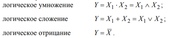 В алгебре логики существуют три основных операции между логическими переменными: логическое умножение (конъюнкция), логическое сложение (дизъюнкция) и логическое отрицание (инверсия). По аналогии с алгеброй чисел в алгебре логики используют следующие обозначения операций: