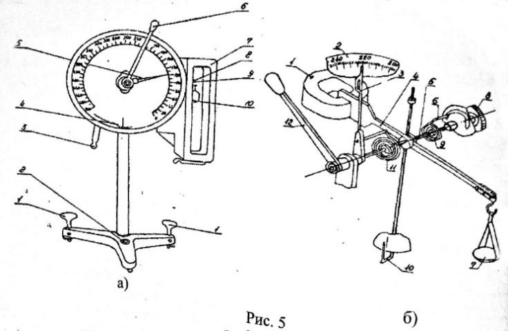 Механизм весов смонтирован в металлическом корпусе, застекленном со стороны шкалы (рис.5а). Сбоку корпуса имеется отверстие для вывода конка коромысла 8 с крючком 9 и чашечкой 10, закрытых остекленным футляром 7. В нижней части корпуса расположена ручка арретира 3, удерживающего коромысло весов при хранении, переносе, нагрузке и разгрузке весов.