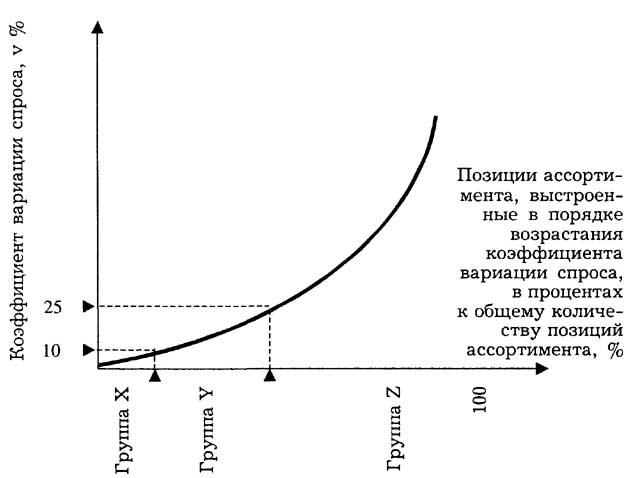 Построение кривой XYZ осуществляется в прямоугольных координатах (рис. 2). По оси ОХ откладывают позиции ассортимента в порядке возрастания коэффициента вариации спроса, выраженные в процентах к общему количеству позиций ассортимента.