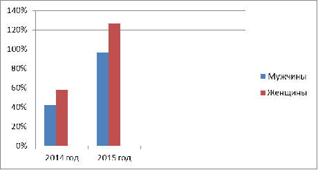 2014 год - 221 человека: 93 мужчины (42%) и 128 женщин (58%), за 2015 год -224