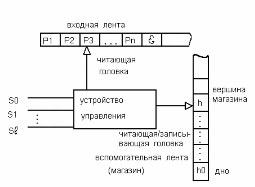 записывает цепочку в магазин вместо символа h. Если = , то верхний символ оказывается удаленным из магазина.