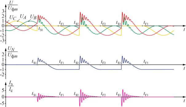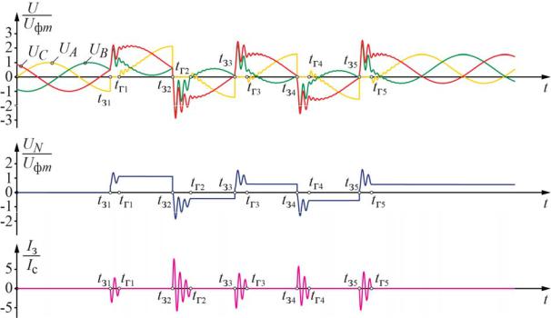 Характерные осциллограммы процесса дуговых ОЗЗ по гипотезе Н.Н. Белякова показаны на рис. 9. Видно, что ток дуги гаснет не при первом его переходе через нулевое значение, что вызвано условием Uп.г. ≤ 0,4