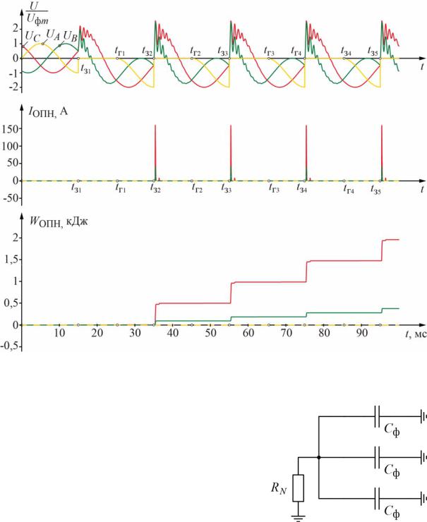точно длительно. Поэтому снизить уровень перенапряжений можно, обеспечив быстрый разряд емкостей сети в контуре нулевой последовательности. При изолированной нейтрали этот контур разомкнут, и фазные емко-