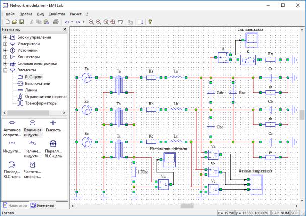 Программа расчета установившихся и переходных режимов электрических цепей EMTLab разработана на кафедре ТЭВН МЭИ. Скриншот окна программы с расчетной моделью сети с изолированной нейтралью показан на рис. 12.