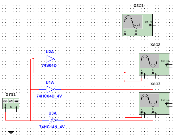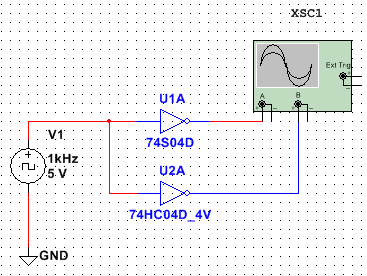 Задание 3. Дополнить схему, подключив к каждому из двух выходов по 5 входов элементов ТТЛ (то есть разместить на схеме еще 10 элементов). Можно использовать те же самые (74S04D) или другие элементы серии 74S; главное — обеспечить нагрузку и 5 логических входов. В полученной схеме измерить высокий и низкий уровни напряжения нагруженных выходов ТТЛ и КМОП. Сравнить результаты с измерениями в п. 2 и сделать выводы о влиянии нагрузки (в виде цифровых входов) на параметры цифровых выходов различных типов.