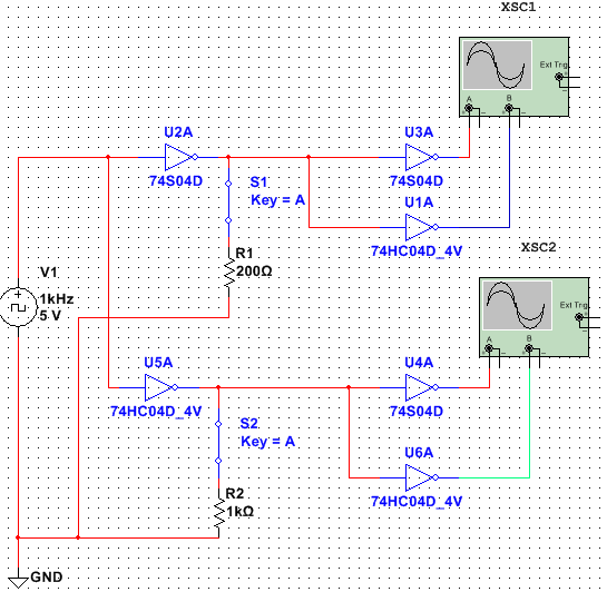 В верхней части схемы (элементы U1A, U2A, U3A) проверяется совместимость выхода ТТЛ со входами ТТЛ и КМОП. В нижней части (U4A, U5A, U6A) проверяется совместимость выхода КМОП с входами ТТЛ и КМОП. Включатели S1 и S2 обеспечивают при замыкании предельно допустимые уровни цифровых сигналов.