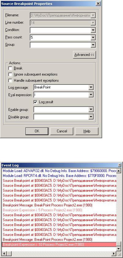 В ряде случаев бывает неудобно или невозможно пользоваться пошаговой отладкой программ. В таких ситуациях можно применять контрольные точки, которые не прерывают работу программы, а лишь помещают некоторую информацию в специальный файл трассировки. Для реализации такой точки необходимо открыть окно Source Breakpoint Properties (рисунок 4), снять флажок Break и ввести сообщение в поле раскрывающегося списка Log message. Можно также в поле списка Eval expression ввести некоторое выражение, которое будет вычислено и вместе с сообщением помещено в протокол работы программы. Этот протокол можно просмотреть в любой момент (в том числе и после завершения прогона программы) с помощью команды View ► Debug Windows ► Event Log (рисунок 7).