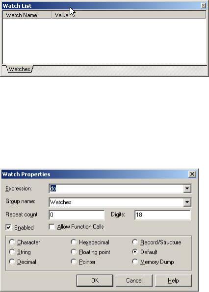 Наблюдать за состоянием переменной или выражения можно с помощью специального окна (рисунок 10), вызываемого командой View ►Debug windows ► Watches.