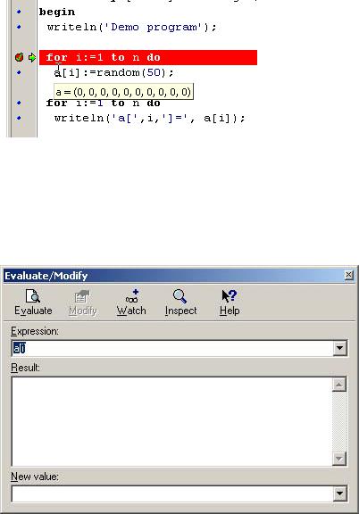 С помощью окна Evaluate/Modify (рисунок 13) можно изменить значение любой переменной. Это окно можно вызвать в режиме отладки с помощью клавиш Ctrl+F7.