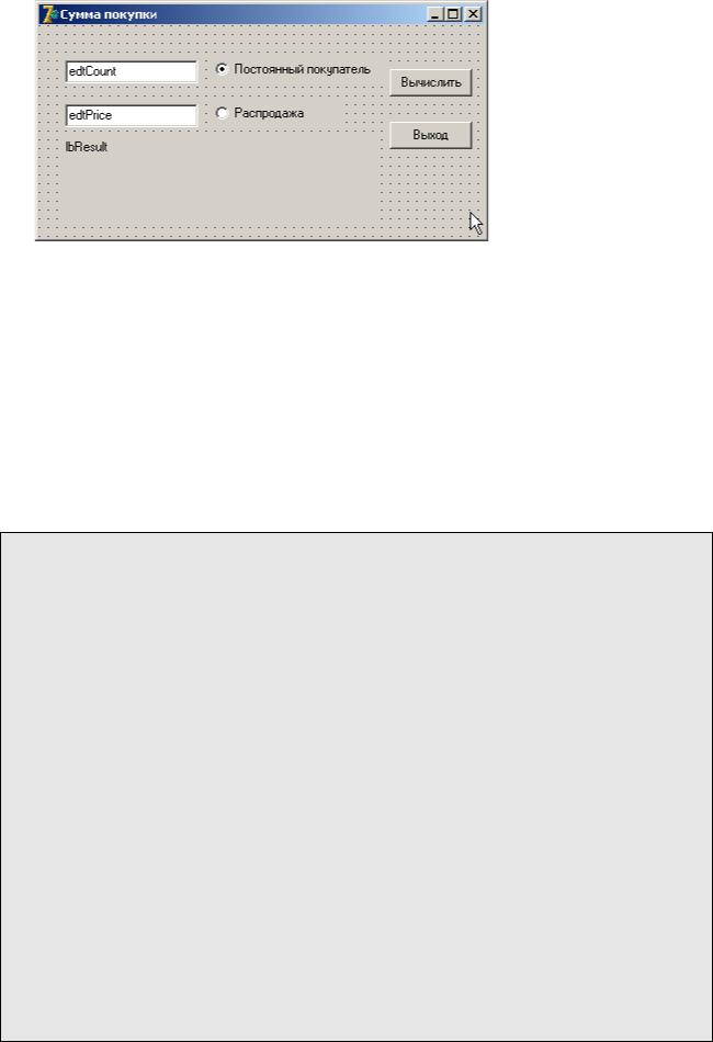 Модифицируем программу из листинга 2. Добавьте на форму компонент TGroupBox. Измените свойство Name на gbDiscount, а свойство Caption на «Скидки».